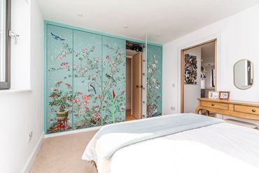 Reworking the layout and creating a second sliding door entrance into the bedroom and a sliding door into the kitchen maximises the space available. Combined with having a bespoke full height wardrobe with then creating a hidden door to allow access through to the new bathroom space gives a great impression of space.